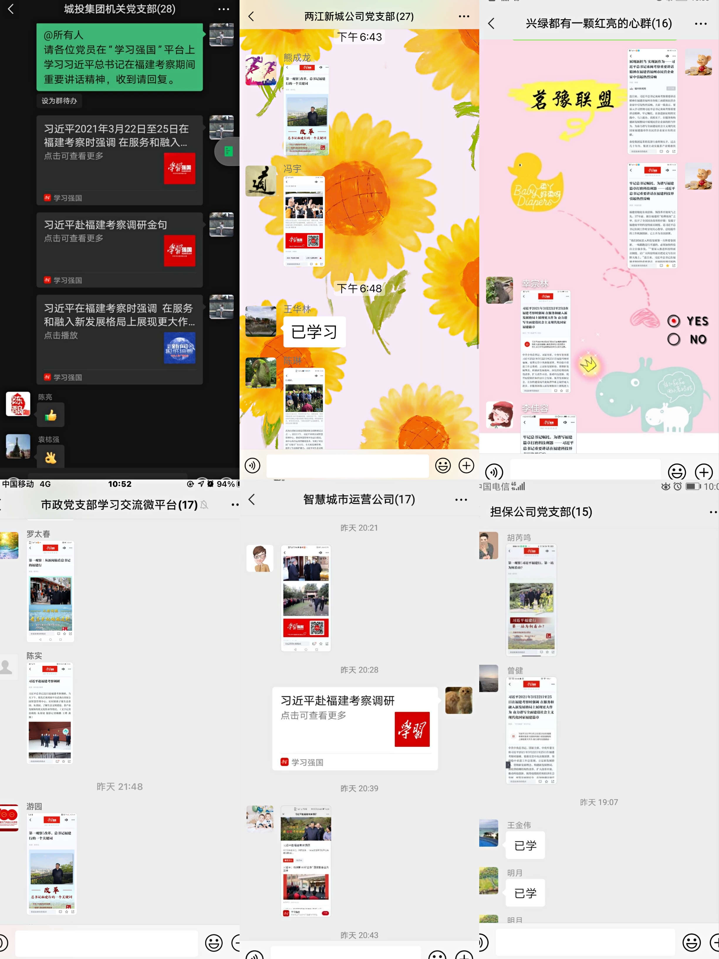 4月13日,瀘州城投集團利用“學(xué)習(xí)強國”、微信群等新媒體平臺,組織黨員干部學(xué)習(xí)貫徹習(xí)近平總書記在福建考察期間重要講話精神。