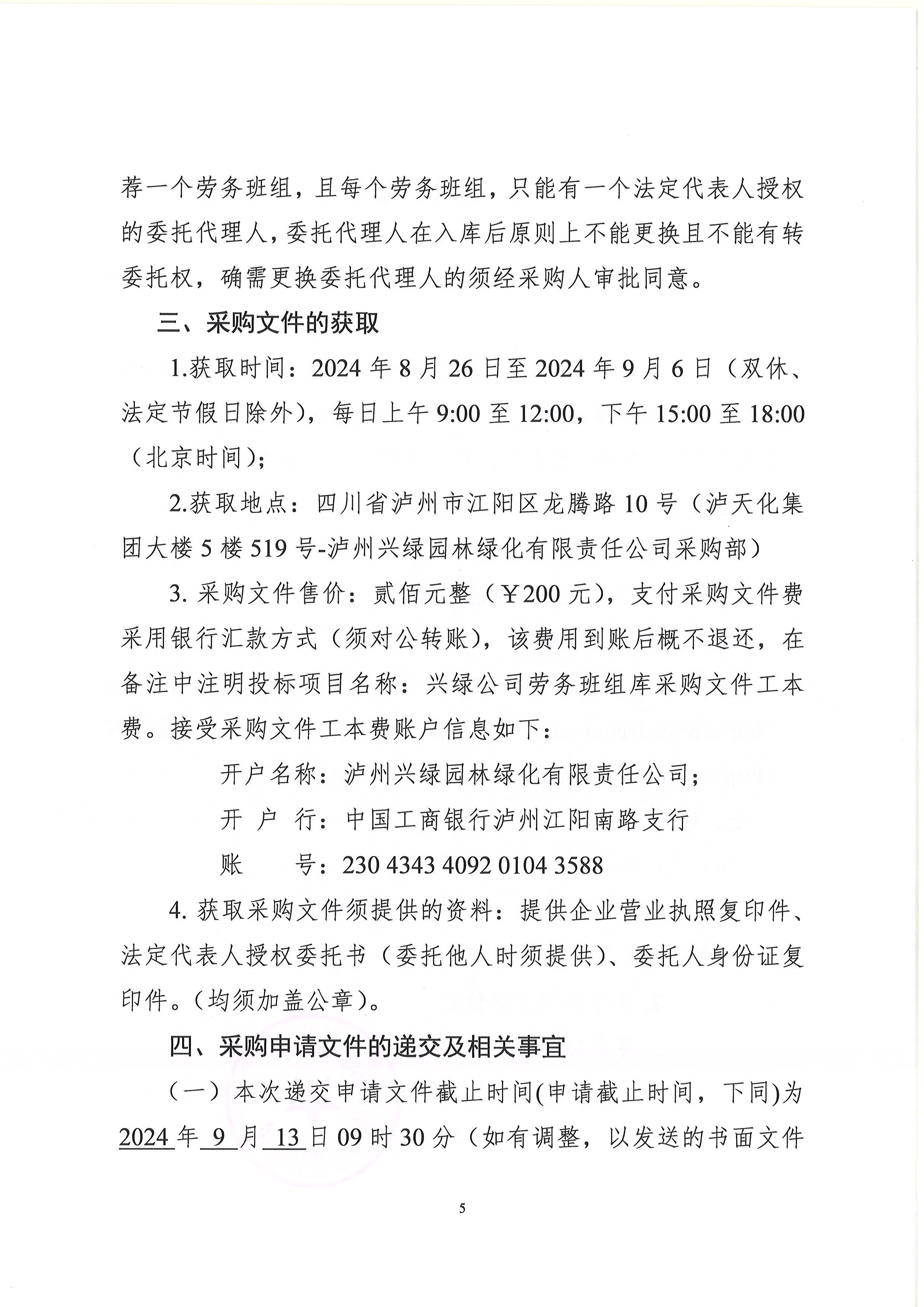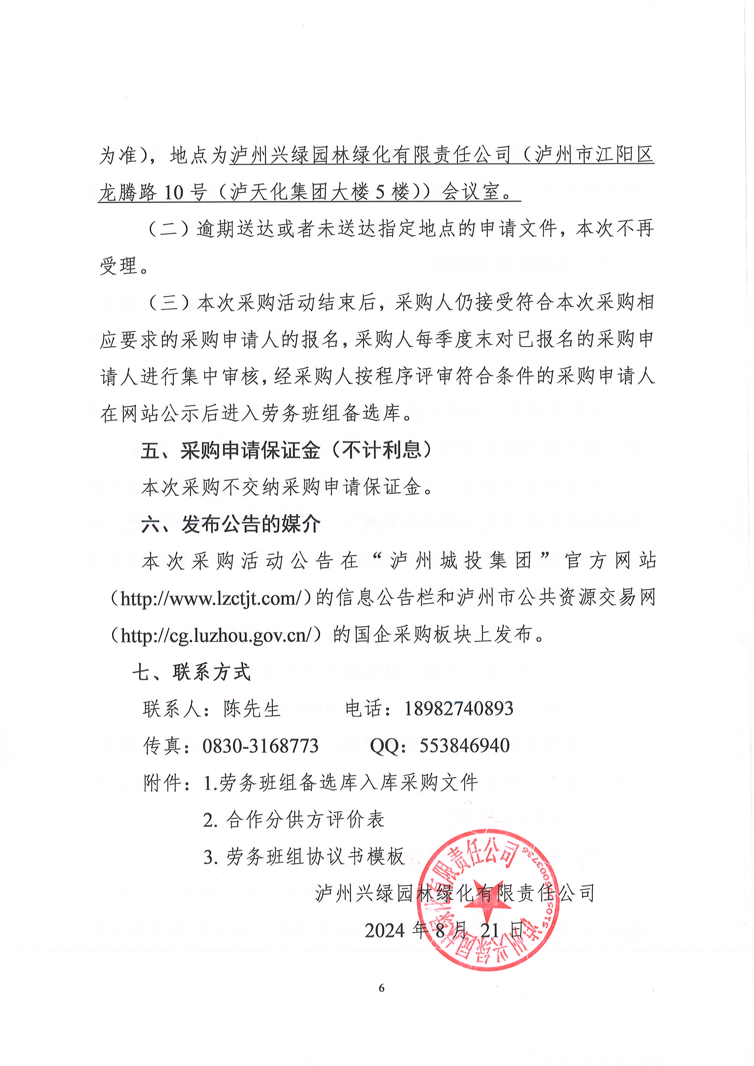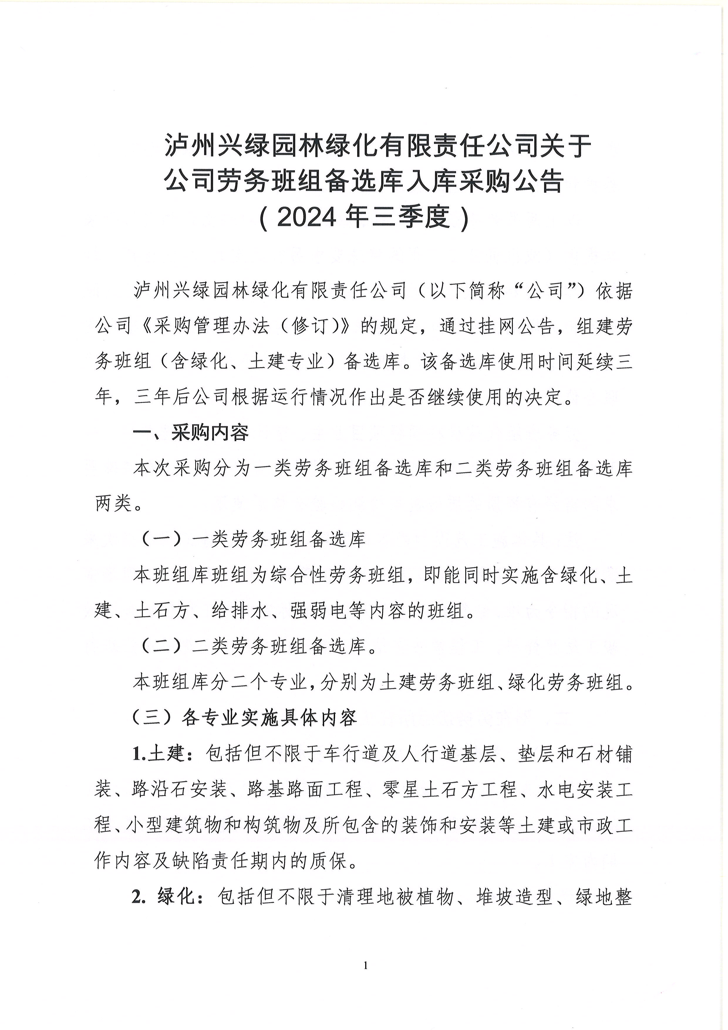 瀘州興綠園林綠化有限責(zé)任公司關(guān)于公司勞務(wù)班組備選庫入庫采購公告(2024 年三季度)